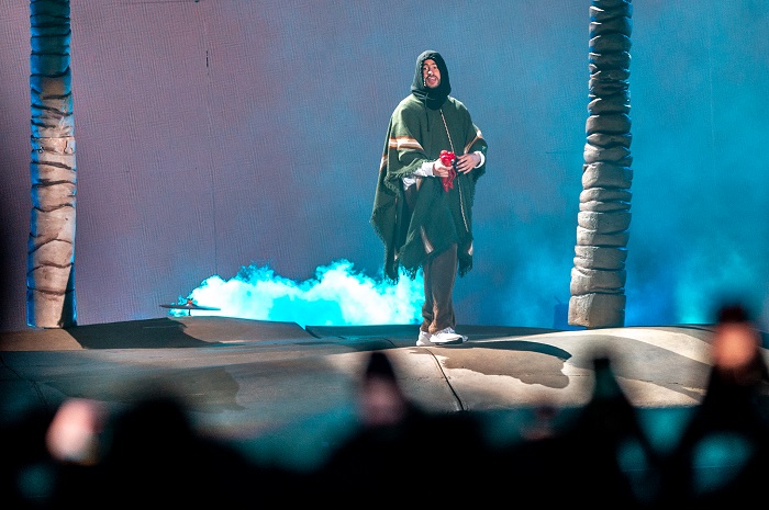 Con total puntualidad, Bad Bunny ingresó al escenario enfundado con un poncho, una capucha y una heladera de camping en la mano, se sentó en la reposera e inició el espectáculo con “Moscow Mule”, siguió con “Me porto bonito”, “Un ratito” y “Efecto”.